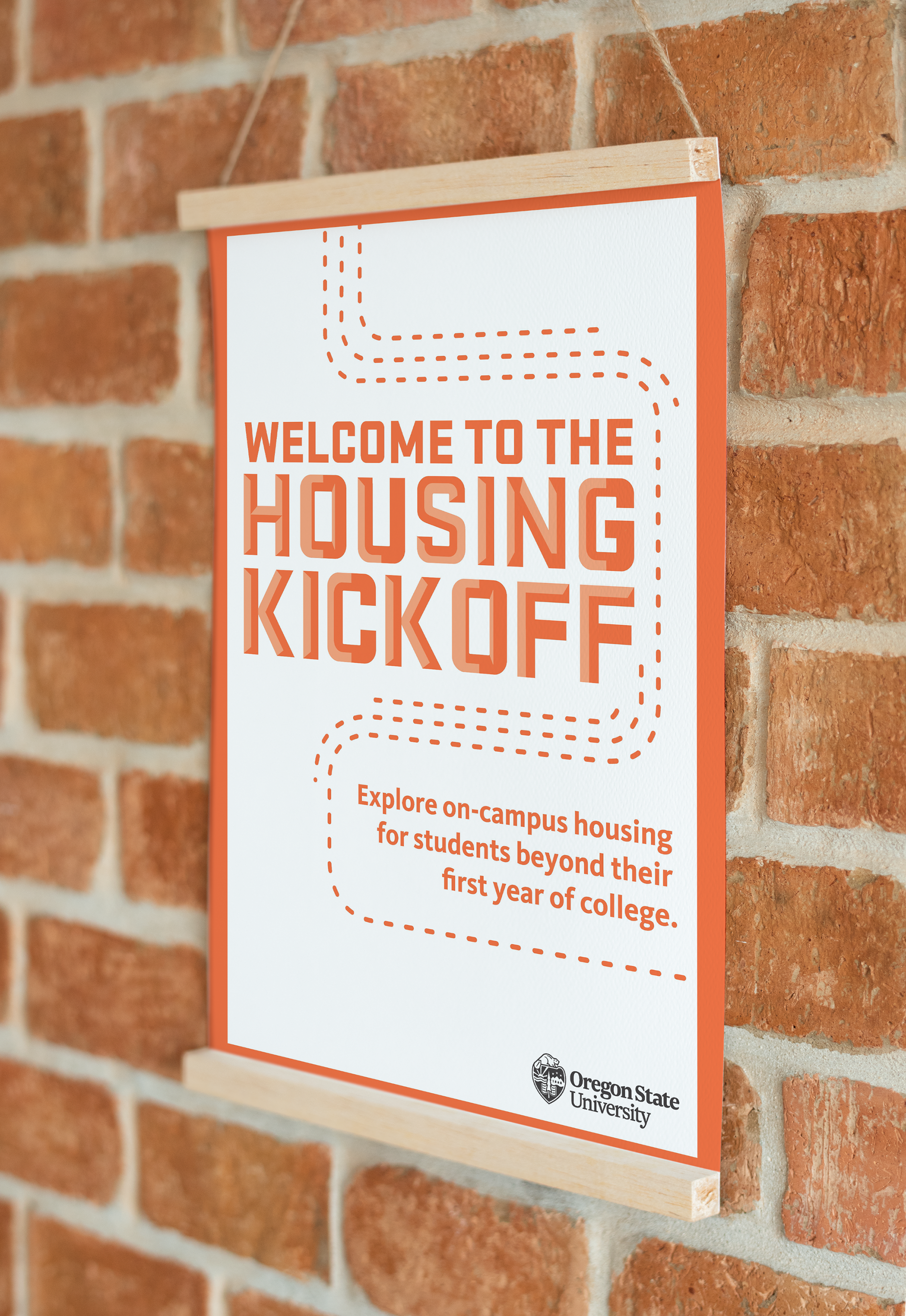 The objective of this project was to encourage second year and above students to continue to live on Oregon State University campus after their first year of college. The university advertises for housing as well as a “housing kickoff” event. This requires deliverables such as advertisement screens, posters, social media posts, as well as day-of event materials.
