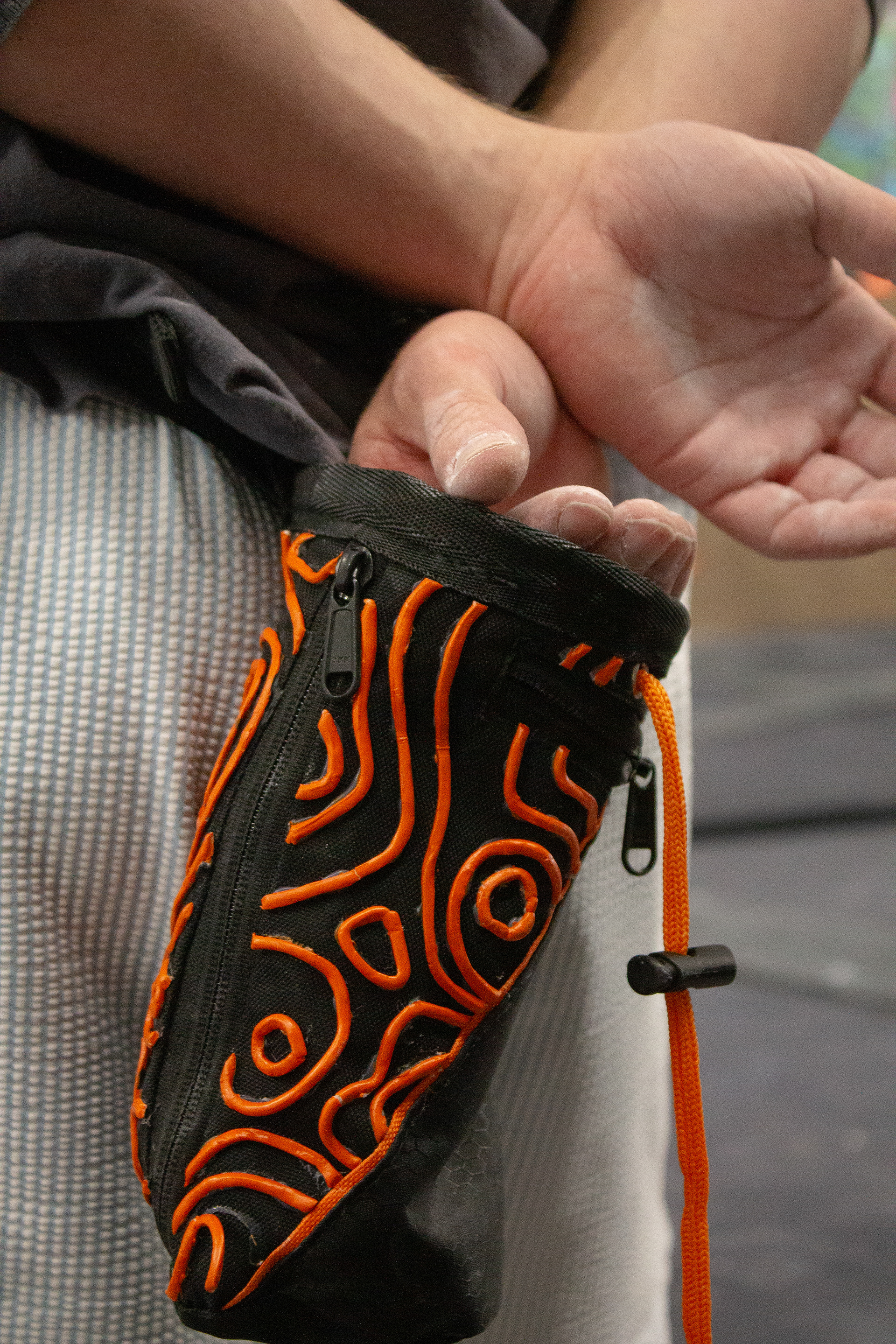 This pouch includes climbing tape, hand salve, nail clippers, a chalk brush, and an extra carabiner.