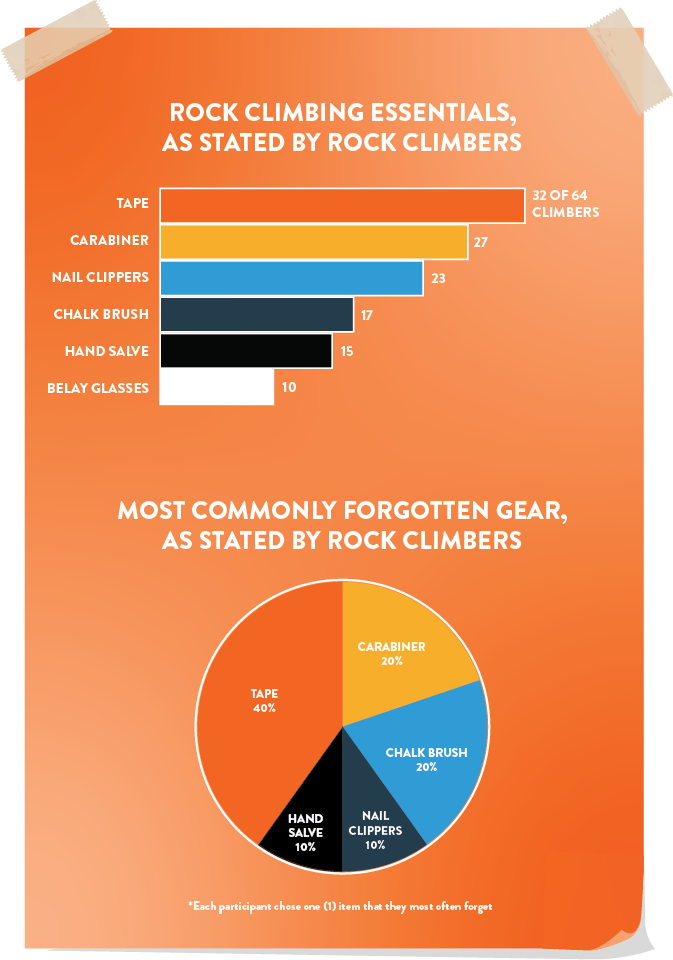 In order to identify an issue, I surveyed many climbing communities, both online and in-person. With this crowdsourcing, I learned that the most prominent issue that climbers experience isn't even through the activity itself- it revolves around the excessive amount of gear needed for climbing. Through further research (displayed on right) I collected information about vital rock climbing gear that the user often forgets to bring to their climbing sessions.